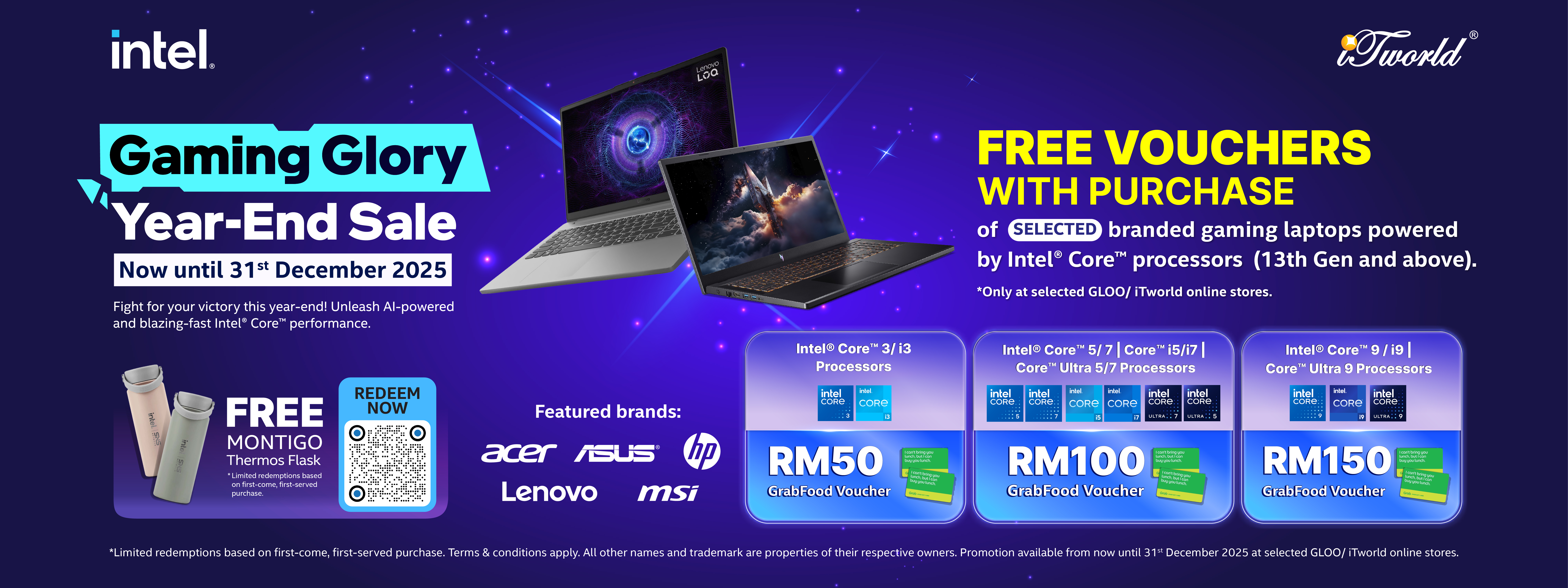 • FREE up to RM150 GrabFood vouchers & Montigo Thermos Flask upon purchase of selected branded gaming laptops powered by Intel® Core™ Processors.(*Limited quantity based on first come first serve basis)