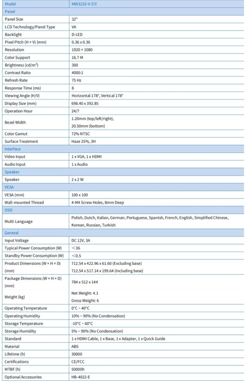• What's in the Box 1 x Uniarch MW3232-V-DT Monitor | 1 x Power Adapter |1 x HDMI Cable | 1 x Stand Base | 1 x User Manual