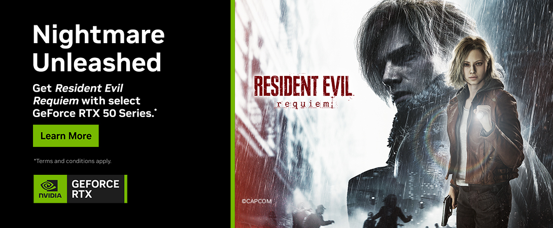 Get Resident Evil™ Requiem with selected GeForce RTX™ 50 Series GPUs, desktops, and laptops.
