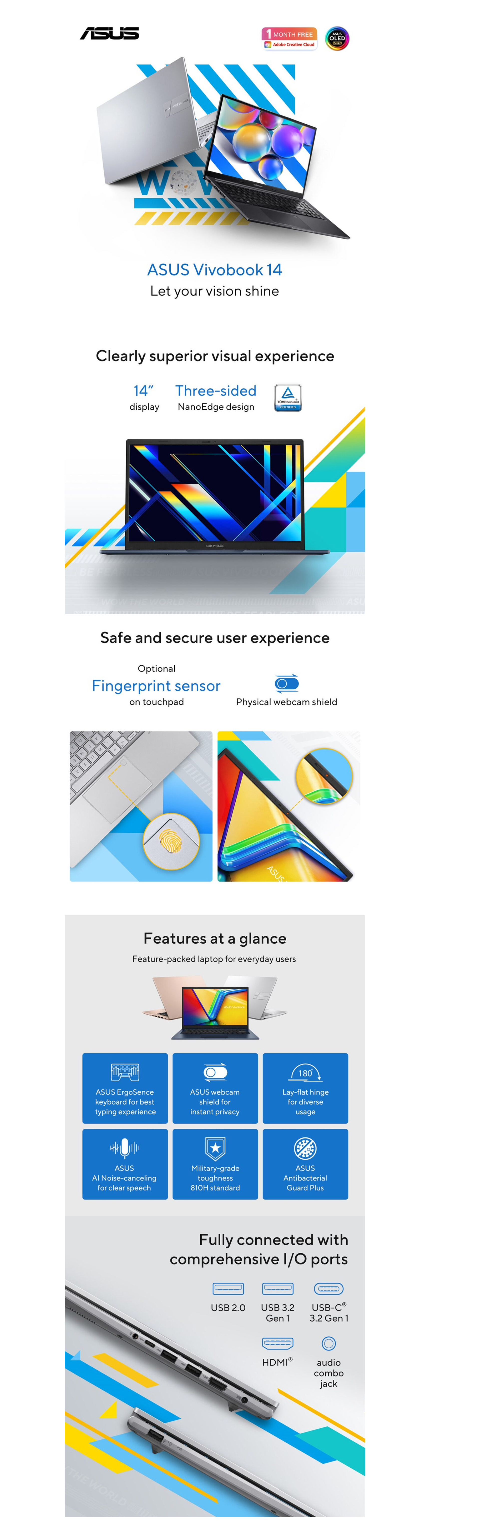 • What's in the Box 1u x Asus Vivobook 14 A1404V-APB012WMS Laptop 1u x Asus Backpack