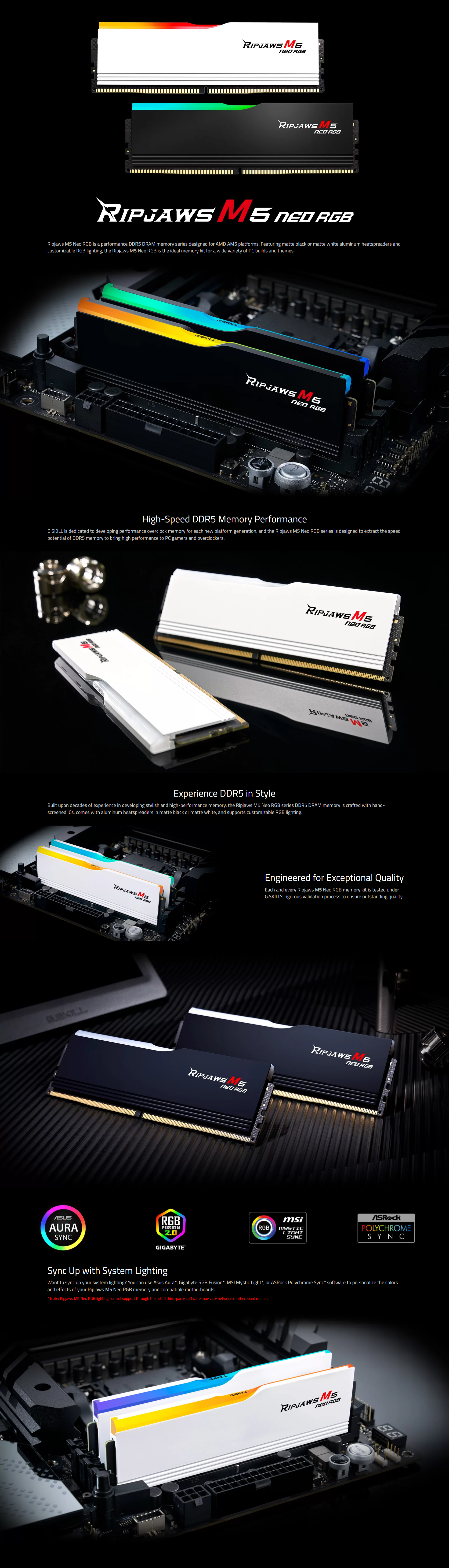 Ripjaws M5 Neo RGB is a performance DDR5 DRAM memory series designed for AMD AM5 platforms. Featuring matte black or matte white aluminum heatspreaders and customizable RGB lighting, the Ripjaws M5 Neo RGB is the ideal memory kit for a wide variety of PC builds and themes.