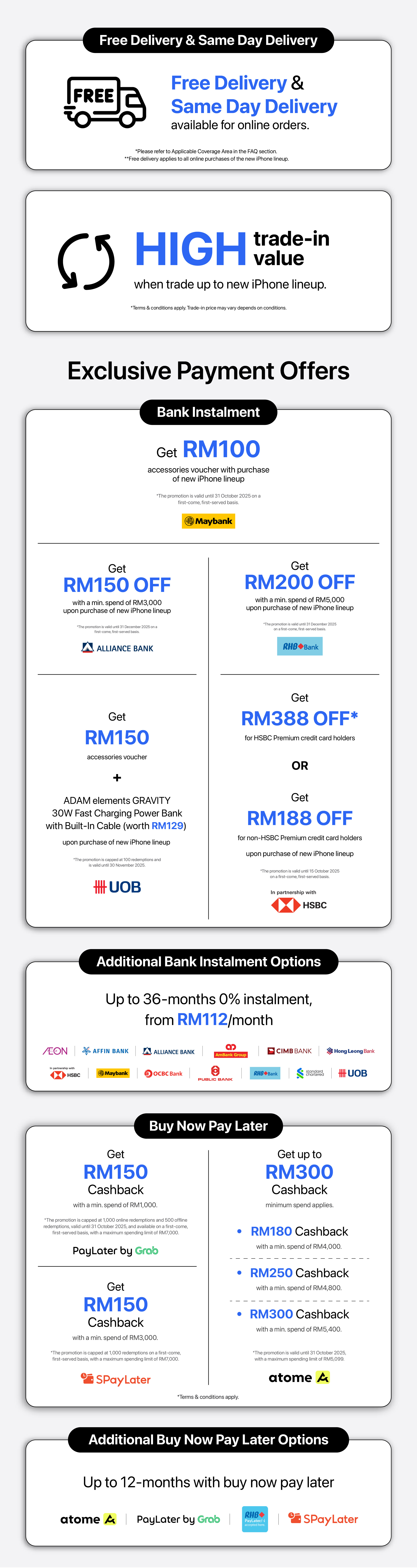 - You can enjoy instalment payment plan up to 12-months with Atome, PayLater by Grab, RHB PayLater or SPayLater.